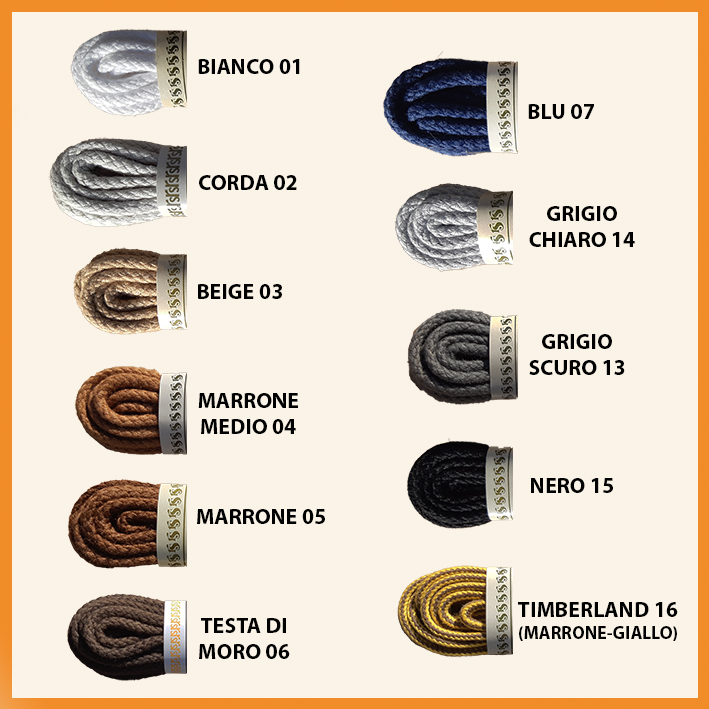 Bianco 01 - Corda 02 - Beige 03 - Marrone Medio 04 - Marrone 05 - Blu 07 - Grigio Scuro 13 -
