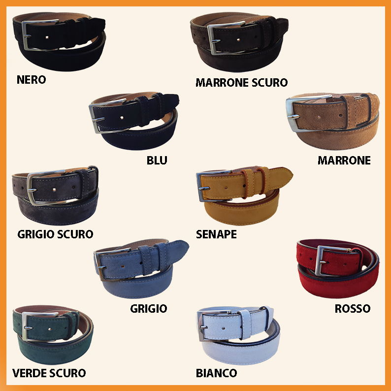 Cintura in camoscio foderata in pelle con cucitura perimetrale. Altezza: cm. 3,5 Misure disponibili: cm 120 Tutti i modelli sono facilmente scorciabili. Colori disponibili: Nero - Bianco - Marrone - Marrone Scuro - Grigio - Grigio Scuro - Blu - Rosso - Verde Scuro